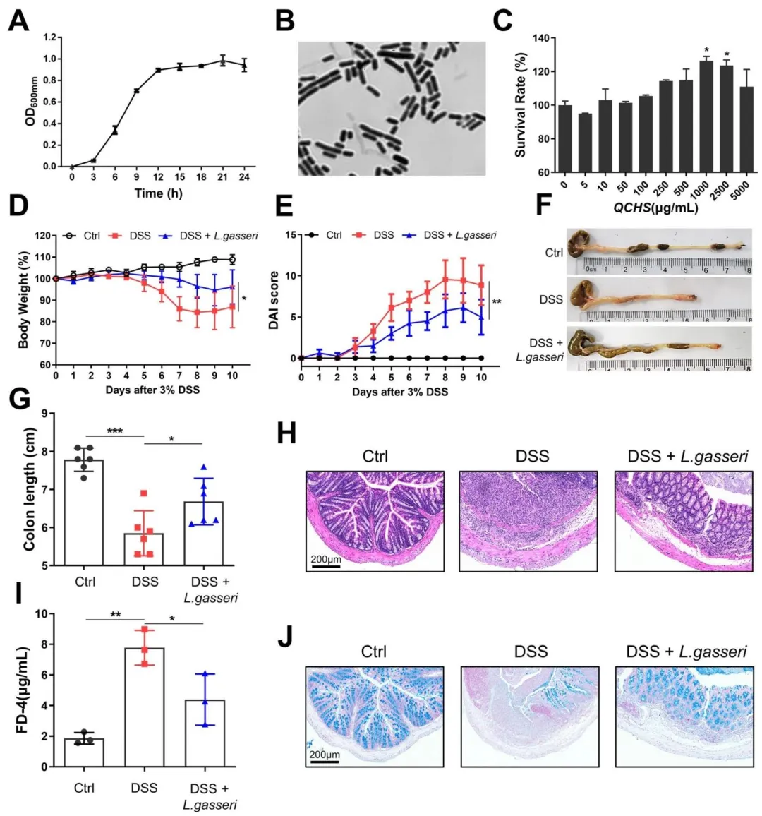 Figure 7:体外验证了 QCHS 可直接促进加氏乳杆菌增殖,同时体内实验证实单独补充加氏乳杆菌可显著缓解 DSS 诱导的小鼠结肠炎与肠屏障损伤,明确加氏乳杆菌是 QCHS 发挥 UC 治疗作用的关键介质。
