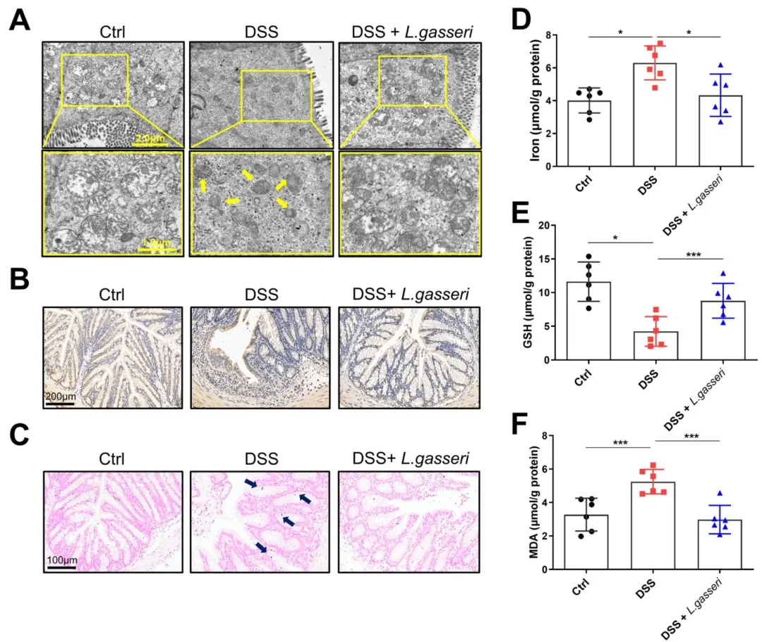 Figure 8:验证了加氏乳杆菌对 UC 小鼠结肠组织铁死亡的直接抑制作用,证实加氏乳杆菌可缓解铁死亡样线粒体损伤,减轻结肠脂质过氧化与铁过载,调控铁死亡核心生化指标,明确其可通过抑制铁死亡减轻结肠损伤。