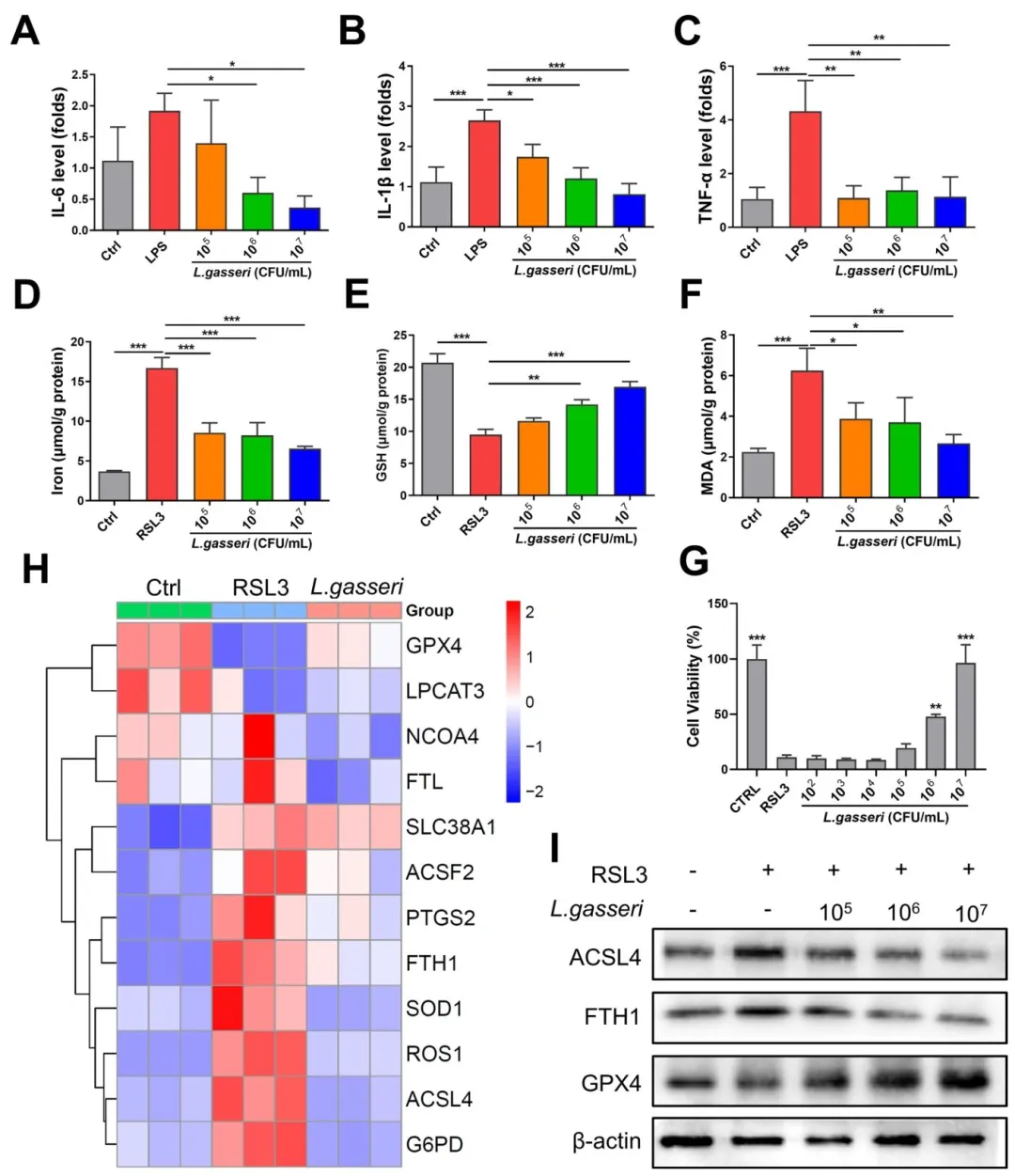 Figure 9:在细胞水平明确了加氏乳杆菌的作用与分子机制,证实其可抑制 LPS 诱导的肠上皮细胞炎症,同时通过激活 GSH/GPX4 通路,抑制 RSL3 诱导的肠上皮细胞铁死亡,首次证实加氏乳杆菌可作为新型铁死亡抑制剂发挥直接作用。