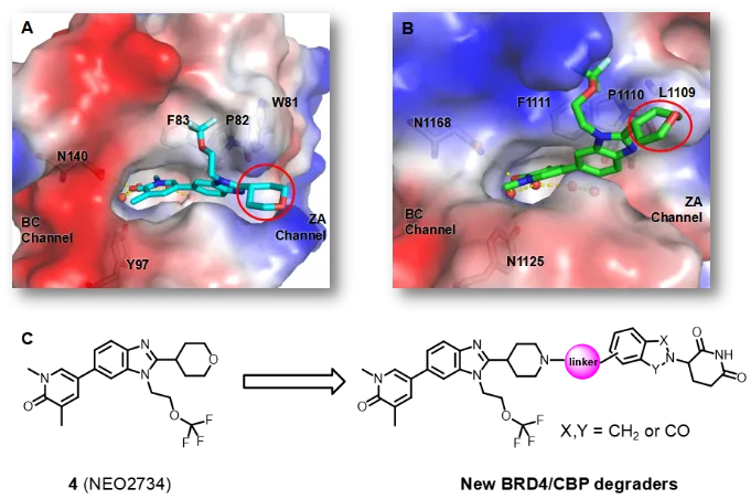 急性髓系白血病(Acute myeloid leukemia,AML)是一种侵袭性造血系统恶性肿瘤,是成人最常见的白血病之一。AML的一个重要特征是其细胞可塑性——即白血病细胞能够动态重塑染色质结构和转录程序——这一特性导致了其对治疗压力的适应能力、生存能力以及频繁复发。溴结构域和额外末端结构域(BET)蛋白家族可识别组蛋白和转录因子上的乙酰化赖氨酸残基,从而调控基因转录。BRD4作为BET家族重要成员之一,在AML发病机制中发挥核心作用,从而维持MYC等致癌驱动基因的表达。然而,BET抑制剂单药治疗的临床疗效并不理想:疗效有限、剂量限制性毒性(例如血小板减少)及耐药问题。机制研究表明,BET抑制耐药的一个关键驱动因素是CBP/p300介导的代偿性转录激活,该过程在持续BRD4阻断条件下重新激活MYC等致癌驱动因子。尽管BET/CBP双靶抑制剂剂取得了一些进展,但双靶点抑制仍不足以完全清除AML细胞或实现持久缓解,这一局限性凸显了开发下一代策略的紧迫性,以更加全面地抑制BET与CBP的功能活性。