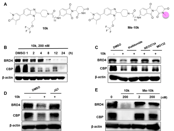 机制研究表明,10k诱导的BRD4/CBP降解依赖于cereblon(CRBN)E3连接酶的招募以及泛素-蛋白酶体系统(UPS)。