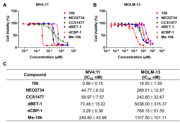 作者在多种急性髓系白血病(AML)细胞模型中开展了系统验证。结果显示,10k在MV4-11细胞中表现出显著的抗增殖活性,IC₅₀仅为0.86 nM,显著优于抑制剂NEO2734及其他对照化合物。在另一种AML细胞系MOLM-13中,10k同样展现出强效抑制能力。