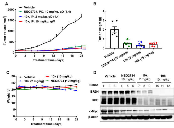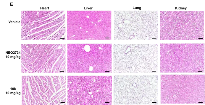 作者进一步在MV4-11白血病异种移植小鼠模型中评估了10k的体内抗肿瘤效果。在为期21天的给药实验中,10k通过腹腔注射给药,在不同给药方案下均表现出显著的抗肿瘤活性。在整个实验过程中未观察到死亡或明显体重下降,显示出良好的耐受性。主要器官的病理学评估未发现明显组织损伤,提示其具有良好的安全性特征。肿瘤组织检测结果进一步证实,10k在体内成功诱导BRD4和CBP的降解,并显著降低关键致癌蛋白c-Myc的表达。在与母体抑制剂NEO2734及临床常用药物阿糖胞苷的对比实验中,10k在相同给药条件下表现出更优的抗AML效果。