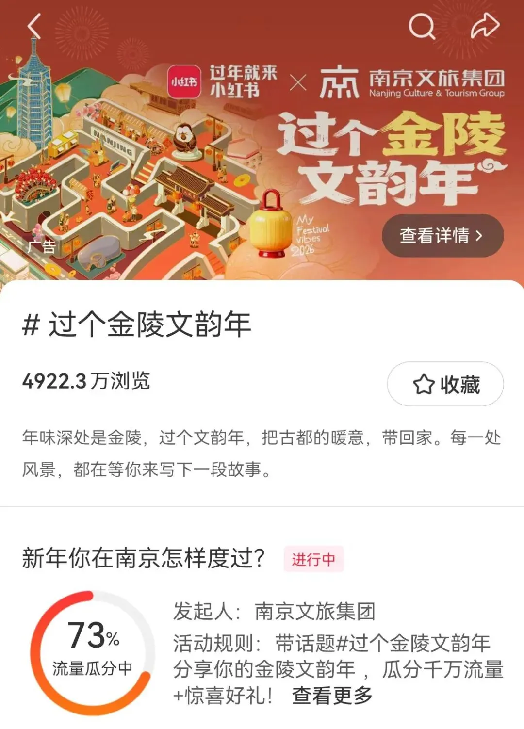 打开小红书,#过个金陵文韵年 的话题热度持续攀升,话题浏览量已突破4900万,全平台曝光量近3亿。