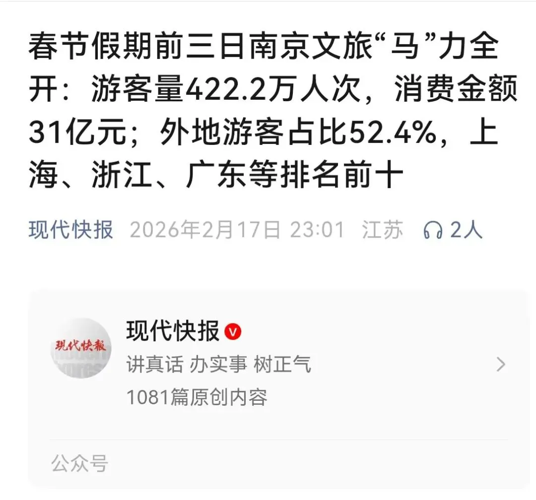 假期还在继续,南京的年味正浓——春节假期前三日,南京接待游客422.2万人次,文旅消费31亿元,外地游客占比52.4%。上海、浙江、广东的朋友们纷纷奔赴而来,过一个独特的“金陵文韵年”。