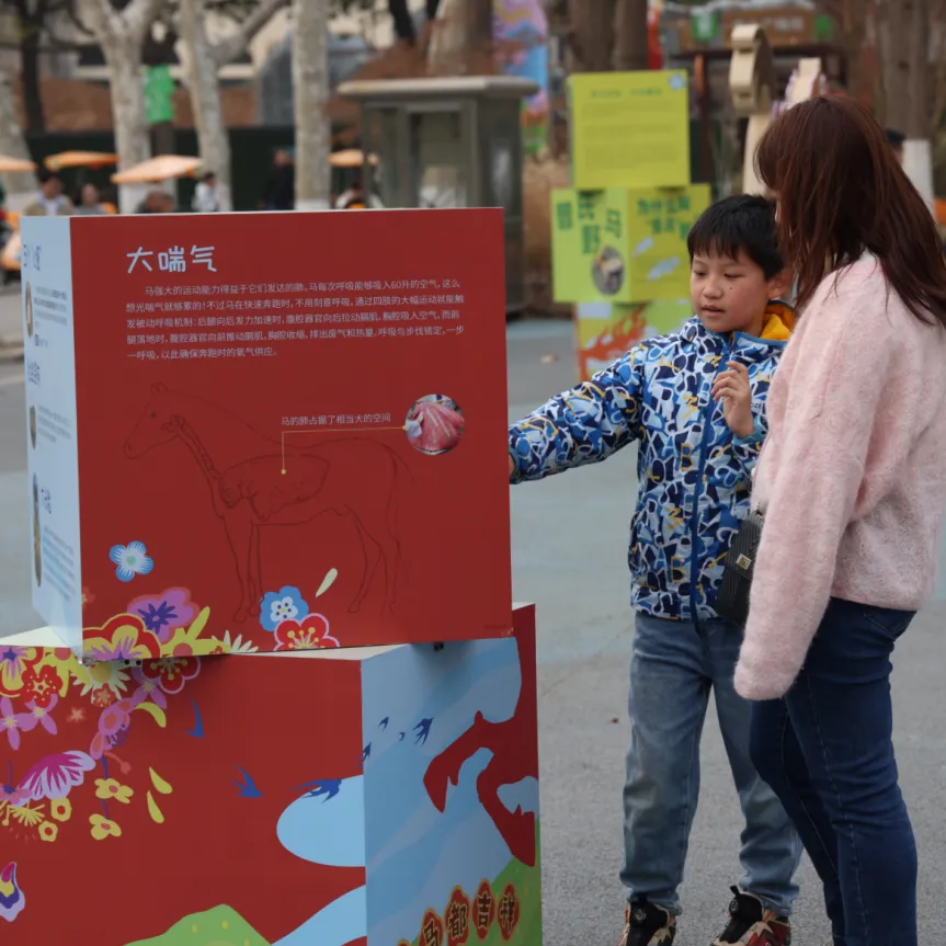 中心广场的“神马都知道”魔方科普展前围满了好奇的大小朋友,“原来马能站着睡觉!”“马的年龄要看牙齿!”的惊叹此起彼伏。六匹造型各异的“神马”散落园区,孩子们兴奋地穿梭打卡,集齐印章时那雀跃的笑容,比阳光还灿烂。