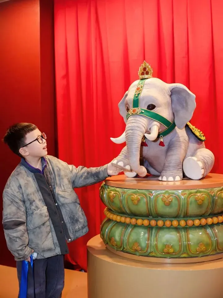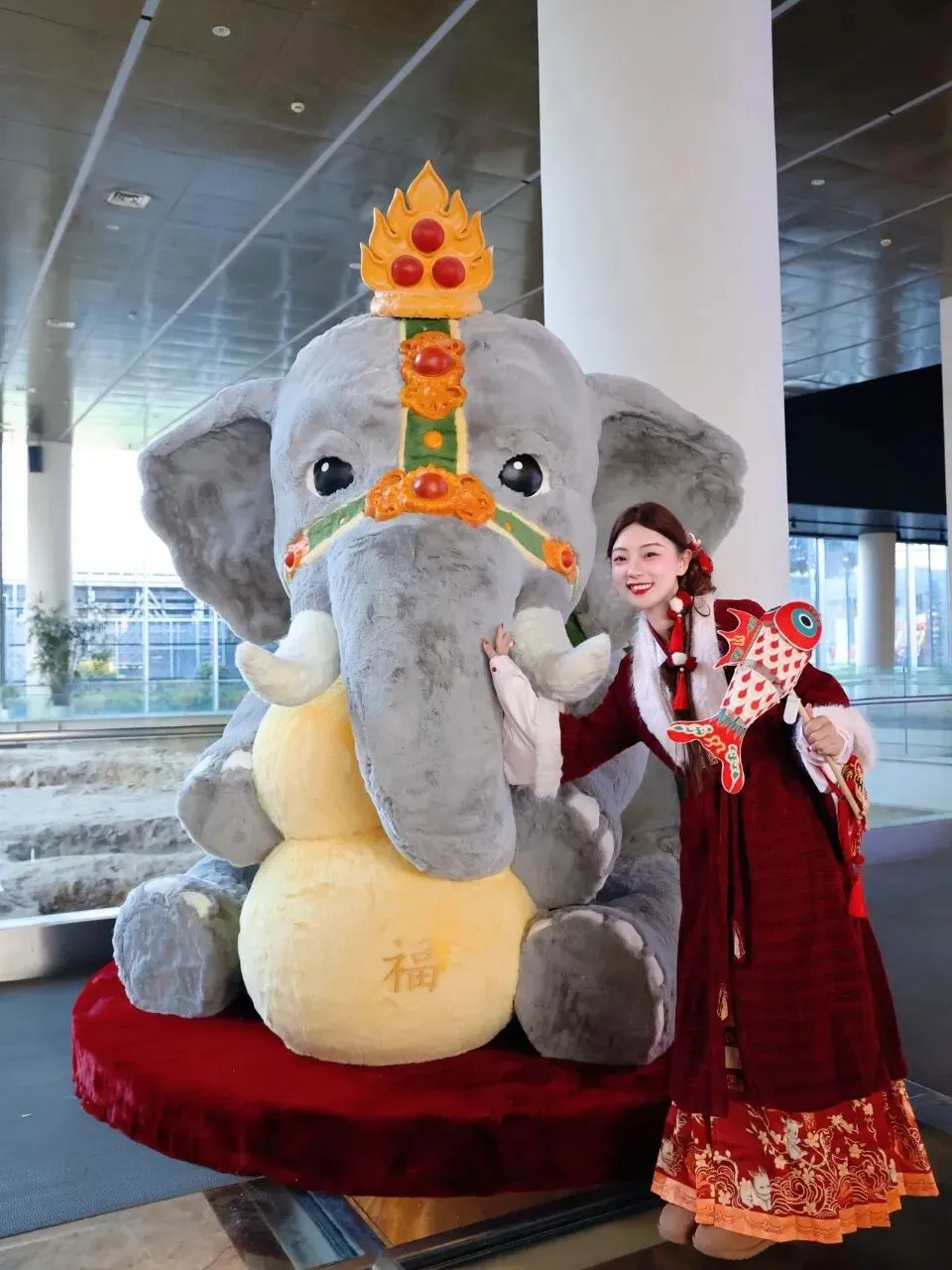 “有求必应”小屋前排起长龙,游客们争相与2.4米巨型毛绒象合影。四大瑞兽小金翅、象宝、毛毛、飞飞全员“上岗”,每位被“召唤”的游客都笑得合不拢嘴。
