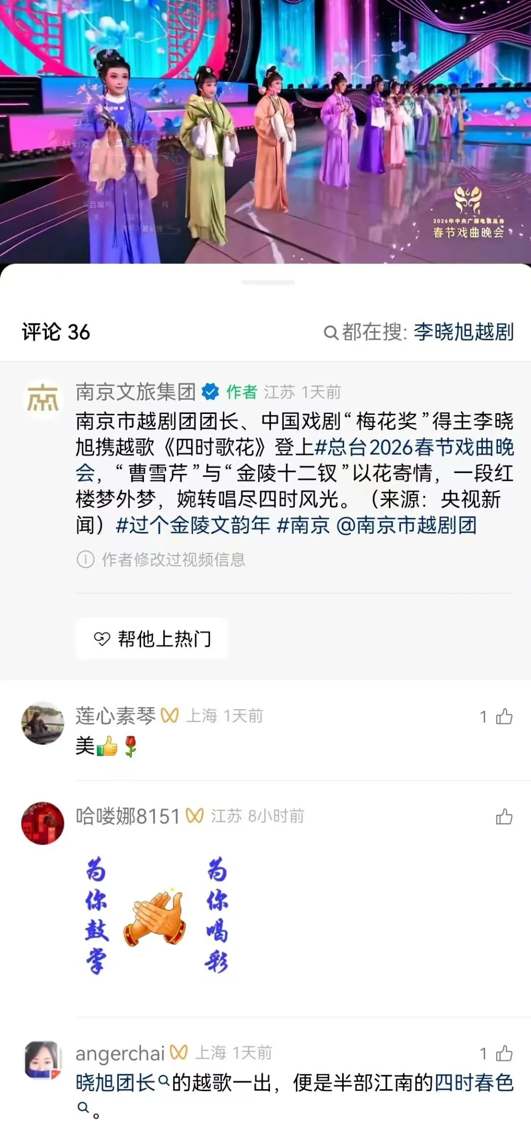 大年初二,中央广播电视总台《2026年春节戏曲晚会》上,南京市越剧团团长、“梅花奖”得主李晓旭以诗韵越剧《织造府》中“曹雪芹”的形象亮相,带领“金陵十二钗”年轻演员献上清雅别致的越歌《四时歌花》。