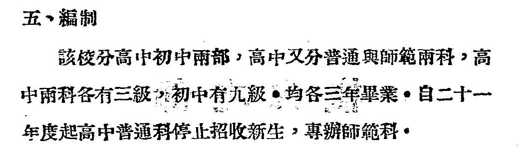 该校高中部分为普高与师范两科,学制三年,另有初中部(三年制)。