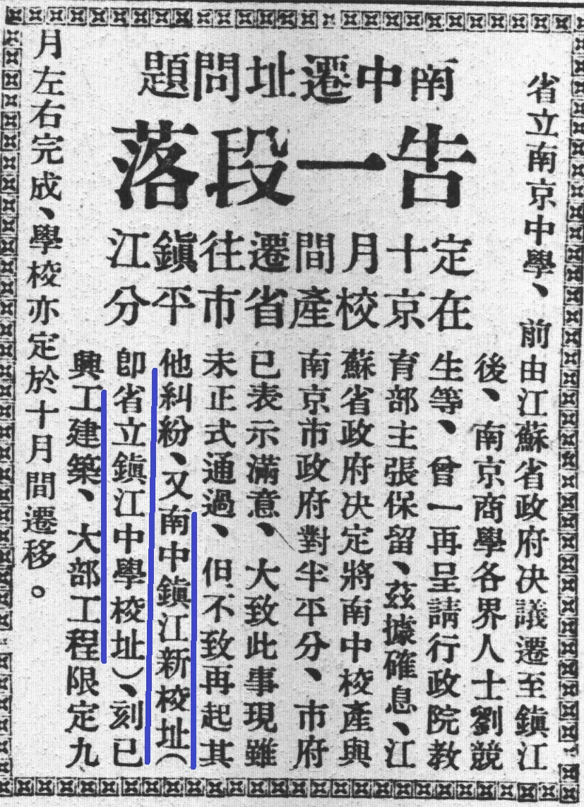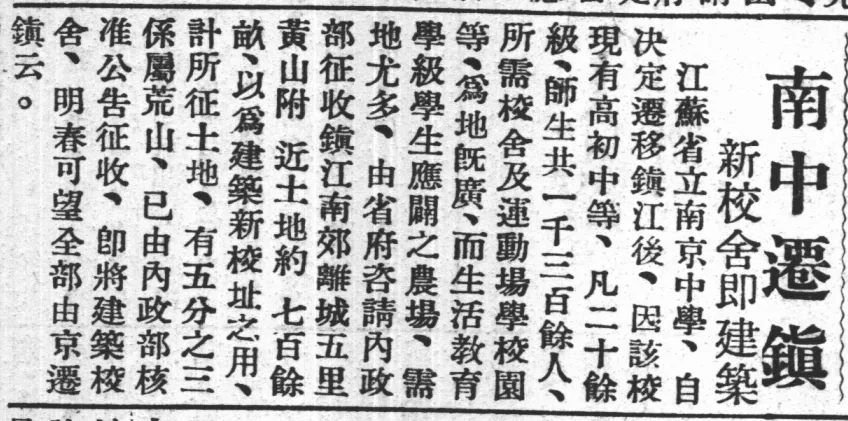 而实际情况是,1930年代中期镇江中学的“重建”几乎完全来自“南京中学”的迁镇改名,而且这次迁校在首都南京闹了一场不小的风波。其与1892年的