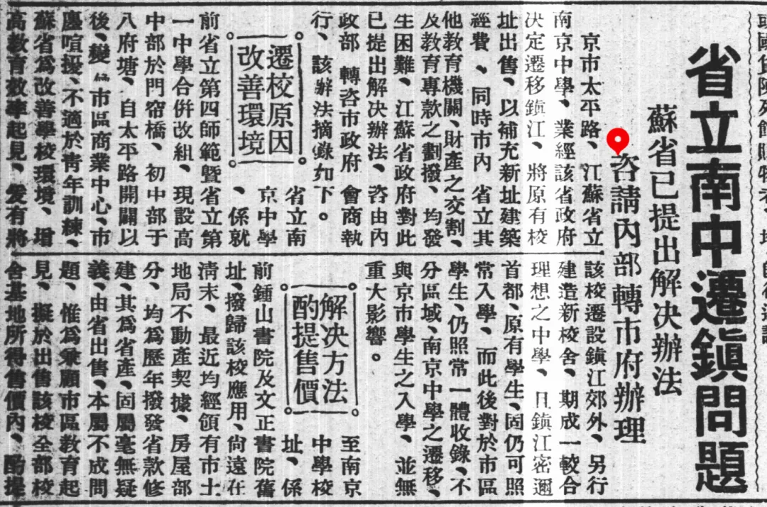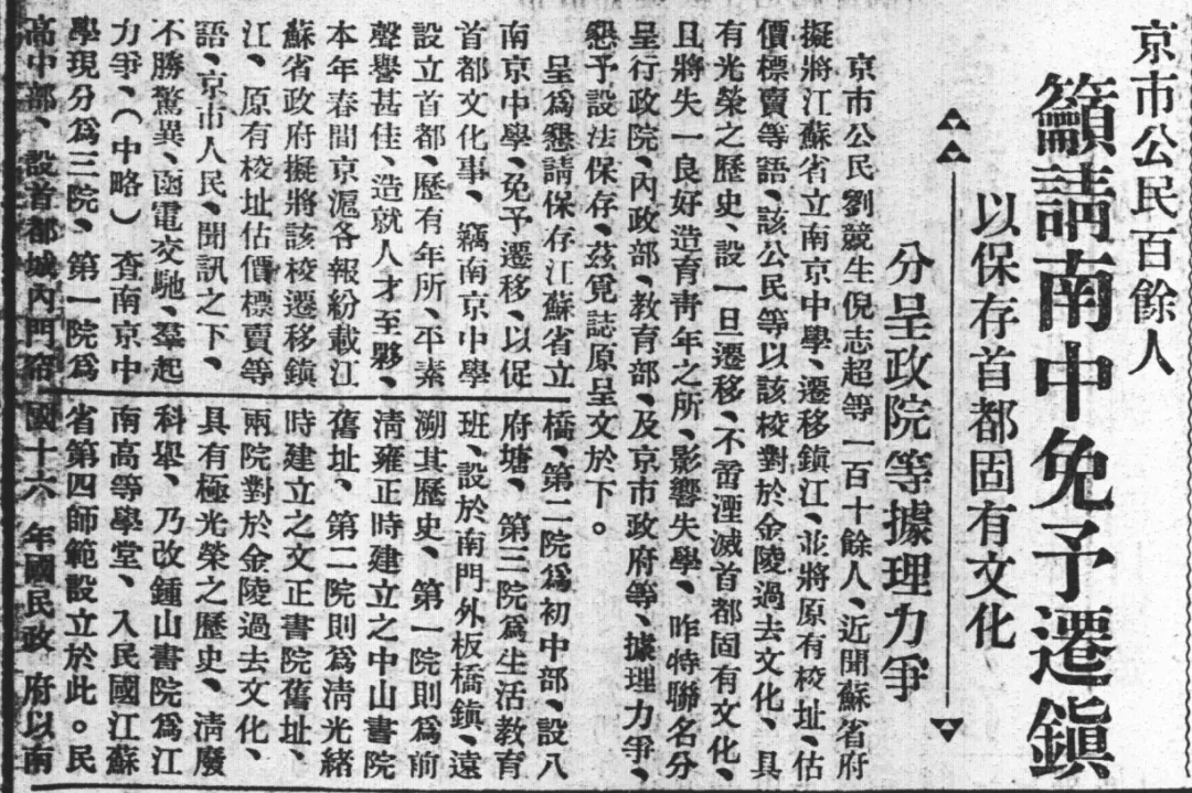 1935年11月,南京更是出现群体向行政院请愿,要求南京中学不迁往镇江的活动,打出了“保存首都固有文化”的旗号。