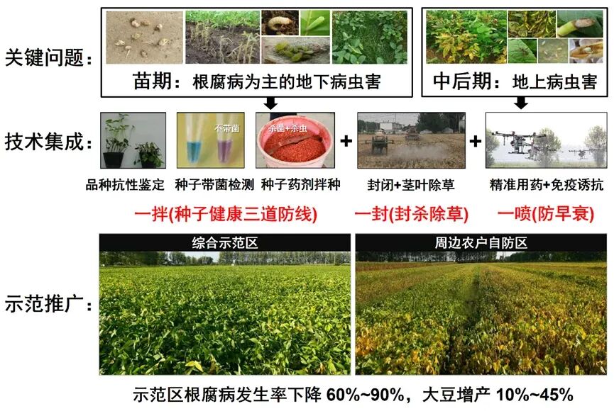 面对大豆根腐病监测手段滞后、品种抗性认知不足、药剂及配套防控技术匮乏等一系列关键难题,王源超教授团队历时十五年开展协同攻关,系统梳理了我国大豆根腐病的病原菌种类及其地理分布特征,揭示了复合侵染是导致病害大规模爆发的核心因素,同时确认种子带菌构成了病害远距离传播的主要通道。在此基础上,团队开发出以种子带菌检测、品种抗病性精准鉴定、种子药剂包衣为核心的多项关键技术与产品,构建起种子健康的"三道防线"。研究团队还创新性地提出"前防苗弱、后控早衰"的根腐病防控思路,整合形成"一拌一封一喷"的全程绿色防控技术体系。自2018年以来,该技术在东北、黄淮海及南方大豆主产区进行大规模示范推广,示范区域内根腐病发生率降低60%至90%,大豆单产提升10%至45%。