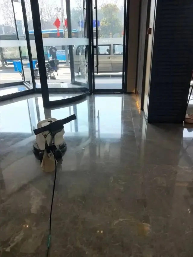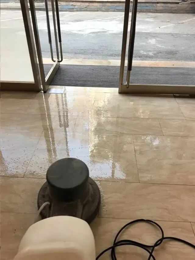 1. 翻新研磨:针对严重磨损、划痕较深的大理石地面,使用意大利进口翻新机配合不同目数的磨片,进行多道工序研磨,消除划痕,平整地面。