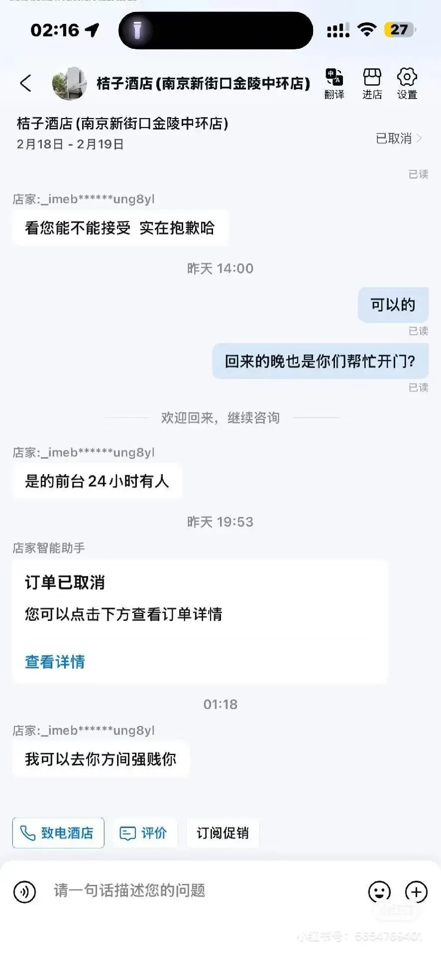 聊天截图显示,该消费者在平台预订了桔子酒店(南京新街口金陵中环店)2月18日-19日的房间,后来该消费者取消订单后,该酒店店家于凌晨1点多发送信息称“我可以去你房间强奸你”。
