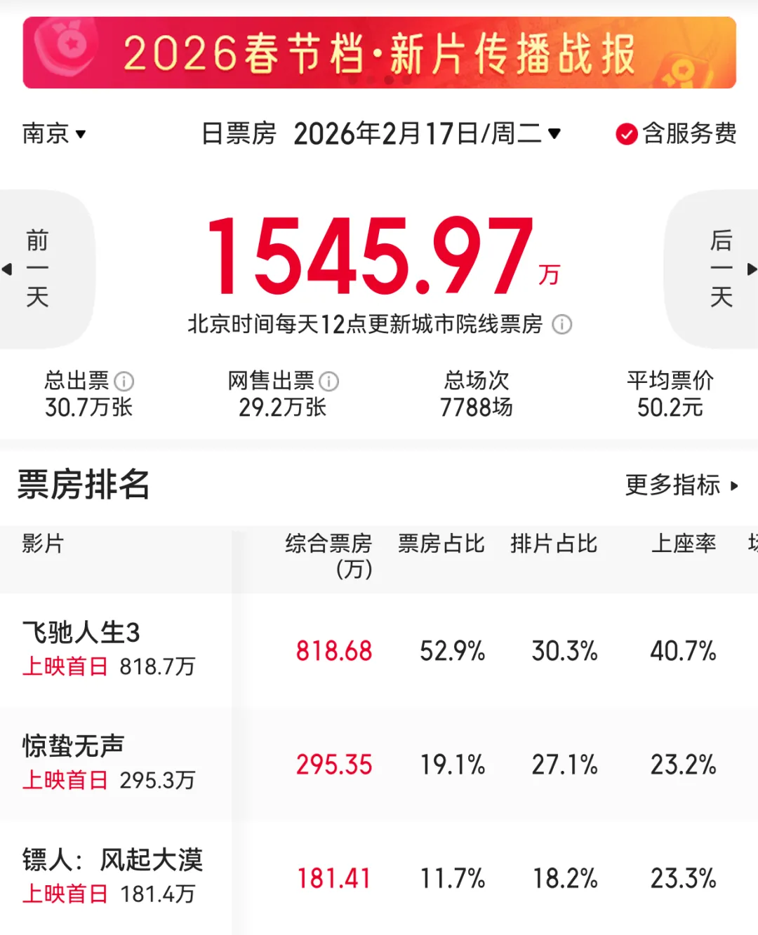 据网络平台数据,截至2月19日11时14分,2026年年度电影总票房(含预售)突破50亿!