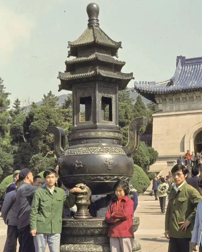 这个大家伙叫铜香炉,肚圆耳大,往上一节一节像小塔,表面一圈圈回纹压住光泽,年轻人爱靠在炉座上拍一张,袖口挽到手腕,军绿色上衣配蓝布裤子,干净得像刚下连队,我舅说,那时候最体面就是翻领扣到顶,腰里再扎条带子,站在香炉边上,整个人都立住了。
