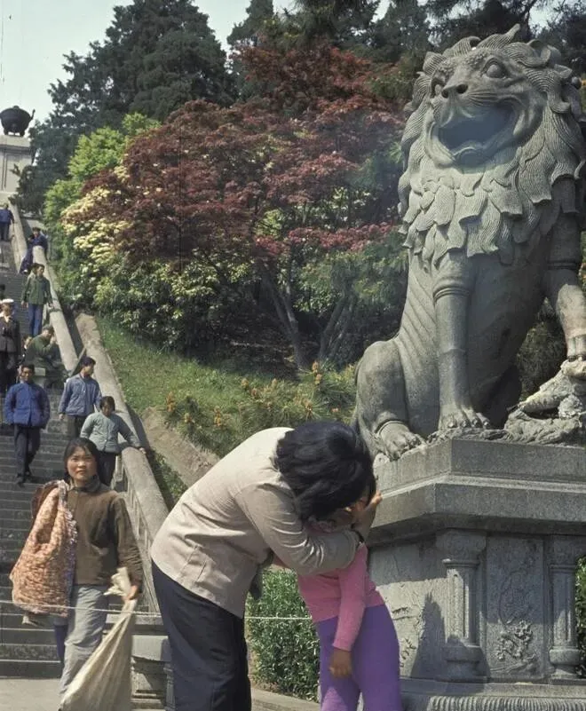 石台上的这位叫石狮,鬃毛一缕缕刻得紧,神色不怒自威,台阶上人来人往,一个妈妈抱着孩子在狮子旁边轻轻亲了一口,孩子穿紫罗兰裤子贴着台面,旁人肩上挎着粗布口袋,里头鼓得像葫芦,装的多半是热水瓶、面包和桔子,那时候出门就这三件宝。