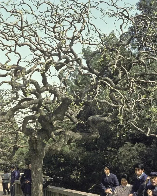 这棵盘成一团的叫虬枝古树,枝条拧着走八字,像在空中打结,树干摸上去粗糙发干,坐栏杆的人把身子一歪,衣服是清一色的深蓝和墨绿,笑也不夸张,就那么温吞吞的,把春天挪到脸上去。