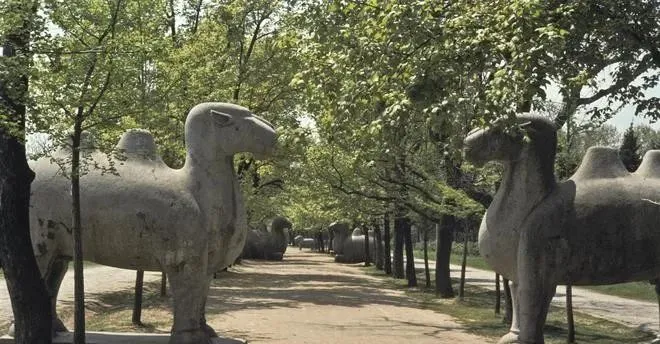 这两头对望的叫石骆驼,驼峰圆鼓,脖子拉得直,神道在树荫底下分出一道浅浅的土路,风把树叶翻亮面,地上点点都是太阳,小时候我喜欢在它们中间跑来跑去,脚下扬起的土味儿和榉树味儿混在一起,像是把一个午后嚼进了嘴。