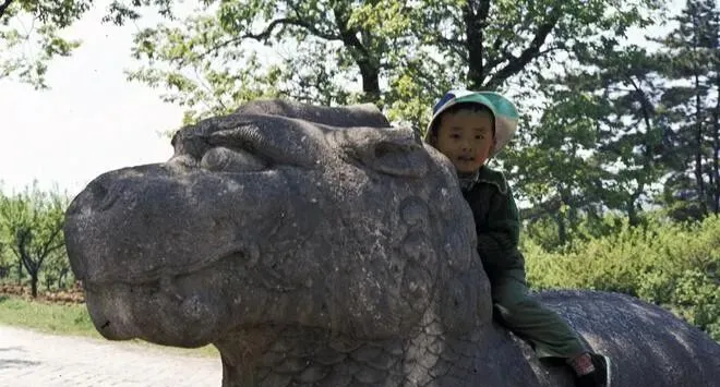 这个笑眯眯的叫石兽,小男孩翻着绿军帽的帽檐坐在背上,鞋底子白得晃眼,他双手抓着脖颈处的凸纹不敢撒,身后的林子里有鸟叫一嗓子就没了回声,妈妈在下面伸手护着,嘴里还说,别乱动,回头给你买根棒冰,那会儿的棒冰五分钱,甜得把牙都黏住。