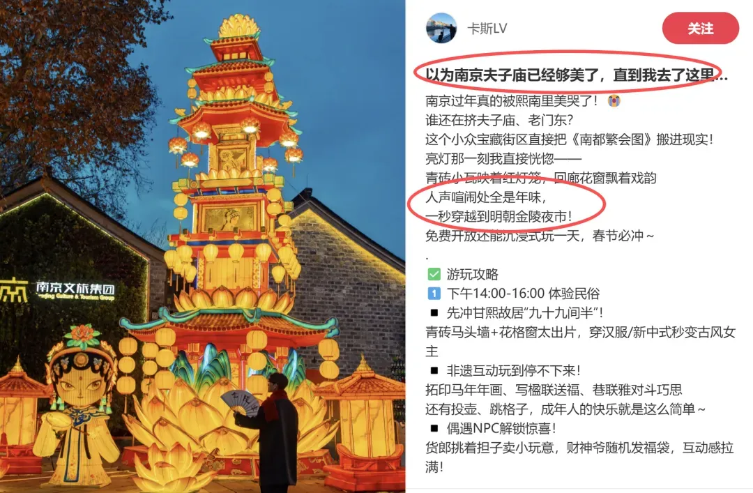 ○如此有“声浪”的南京春节,自然火遍全网。城市级新春IP——“过个金陵文韵年”,达人卡斯LV的笔记《以为南京夫子庙已经够美了,直到我去了这里……》,单篇曝光36万。