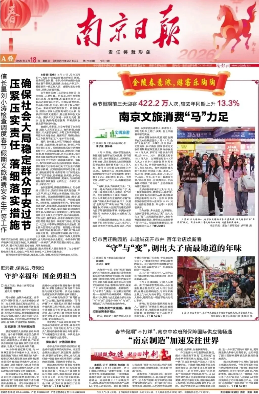 丙午新春,金陵年味氤氲。当千家万户围炉团圆、八方来客畅游古都时,南京市属国企扛起社会责任,从打造多元特色文旅盛宴激活新春消费,到全维发力保供畅行守护团圆归途,再到坚守岗位以科技赋能筑牢城市运行保障,国企人通过点滴行动汇聚城市温暖,全力为市民游客营造有滋味、有保障、有温度的新春氛围。