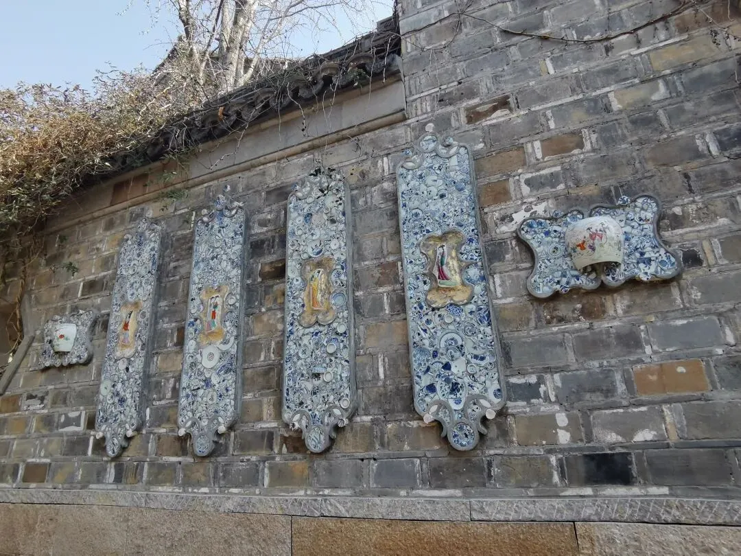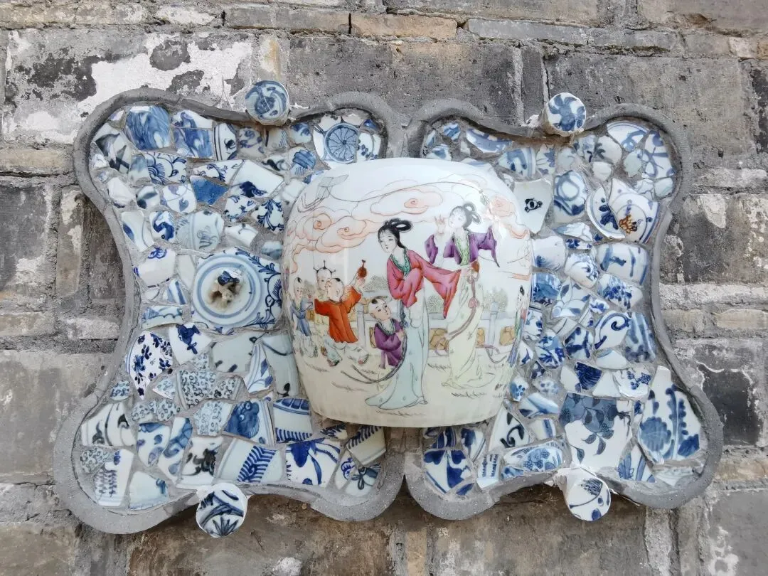 在老门东的小巷深处,还遇见一处用破碎瓷片装饰的灰色砖墙。青花、粉彩、单色釉,零零碎碎的瓷片嵌在墙面里,在午后的阳光下泛着温润的光。