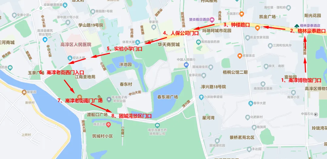 高淳博物馆门口→格林豪泰路口→钟楼路口→人保公司门口→实验小学门口→高淳老街西门入口→高淳老街南门广场→固城湾景区门口