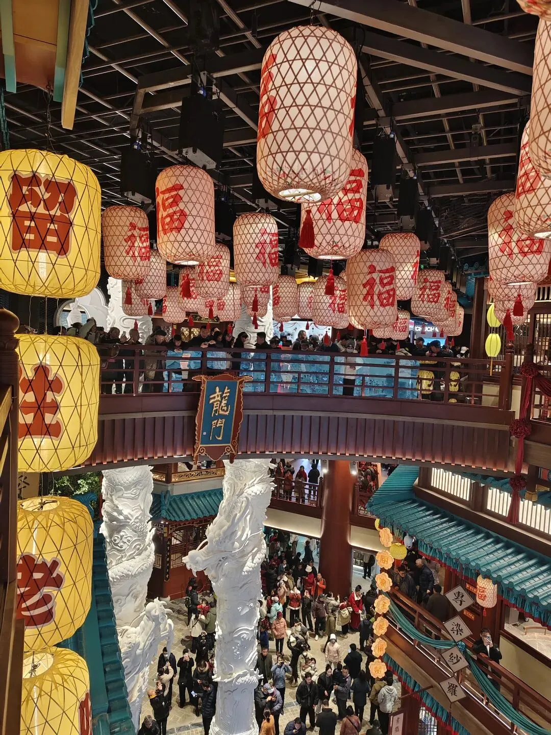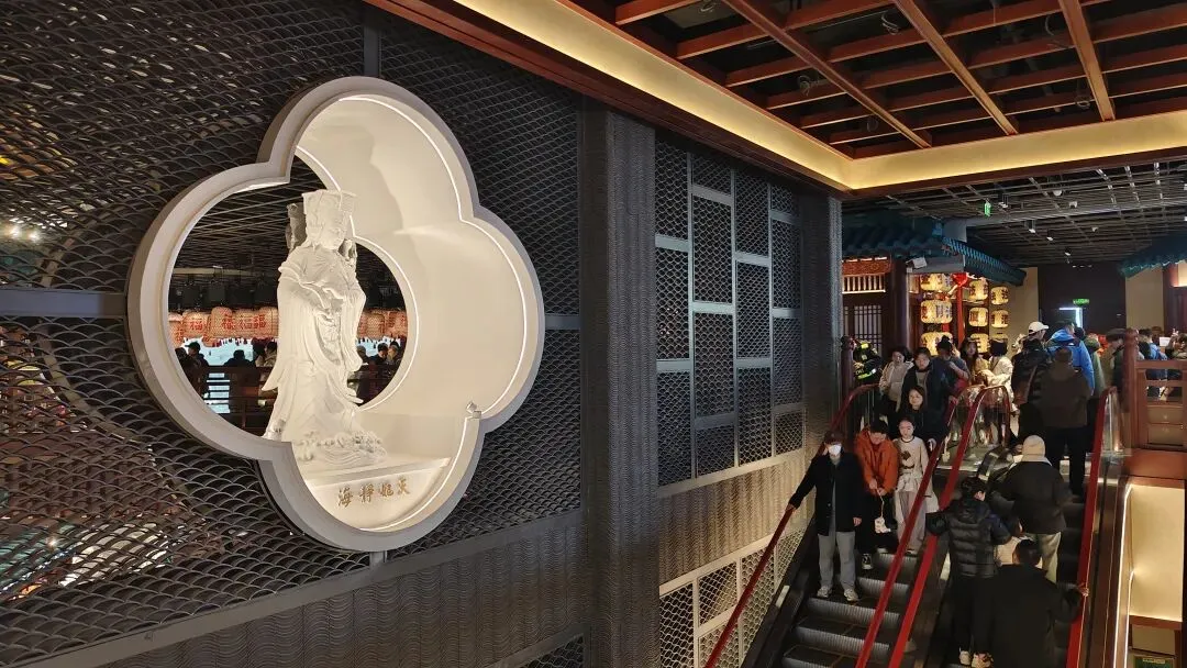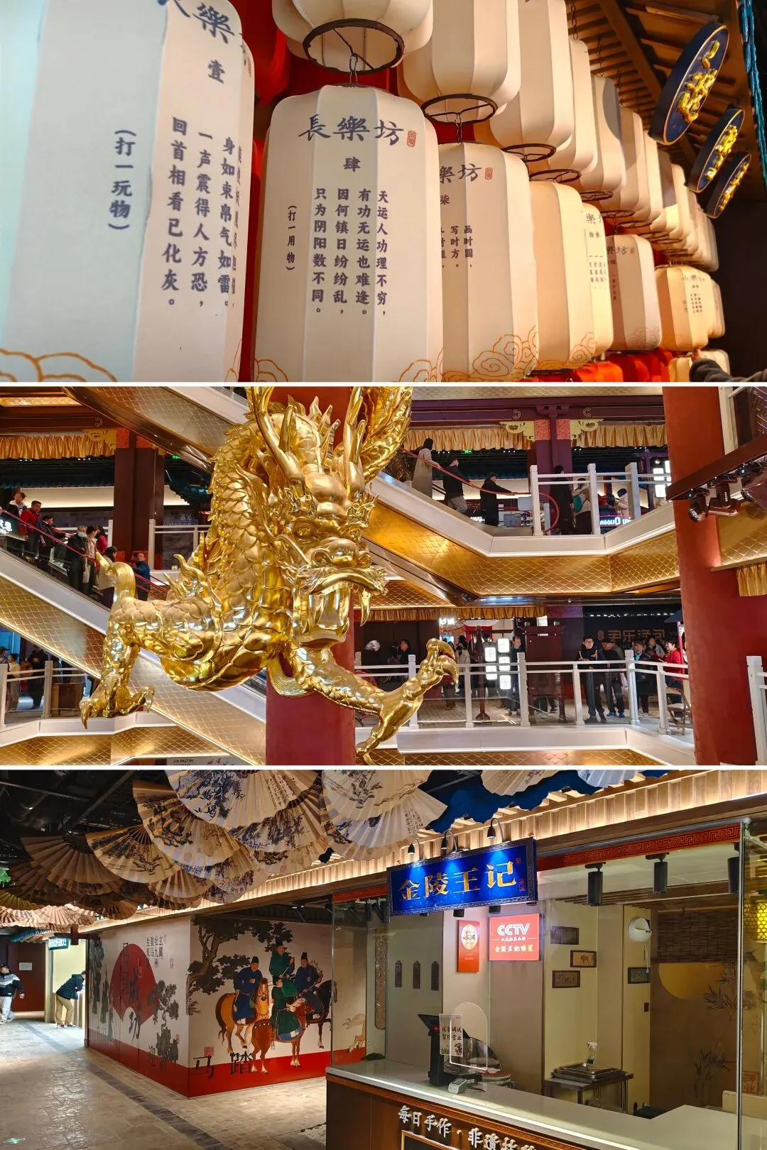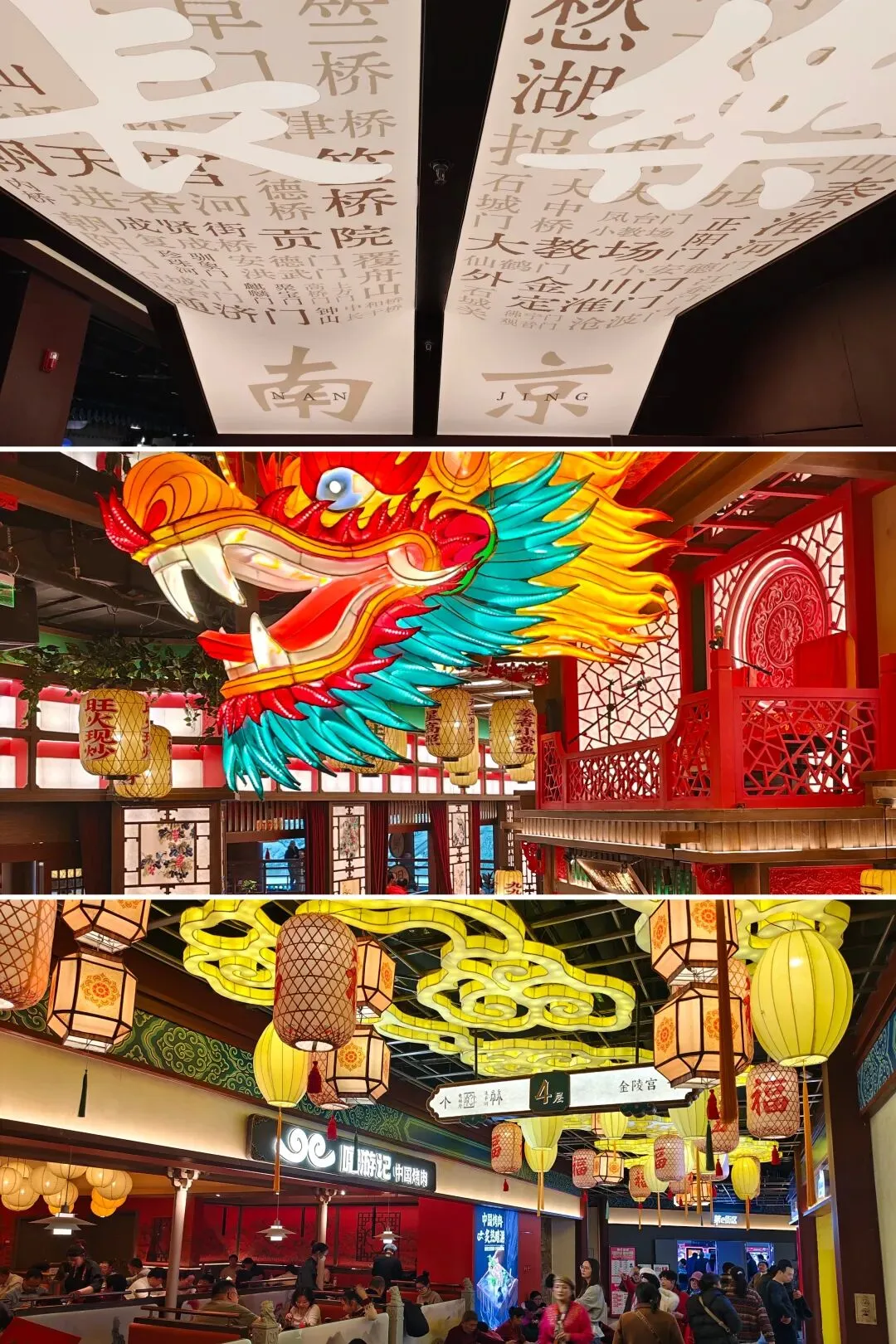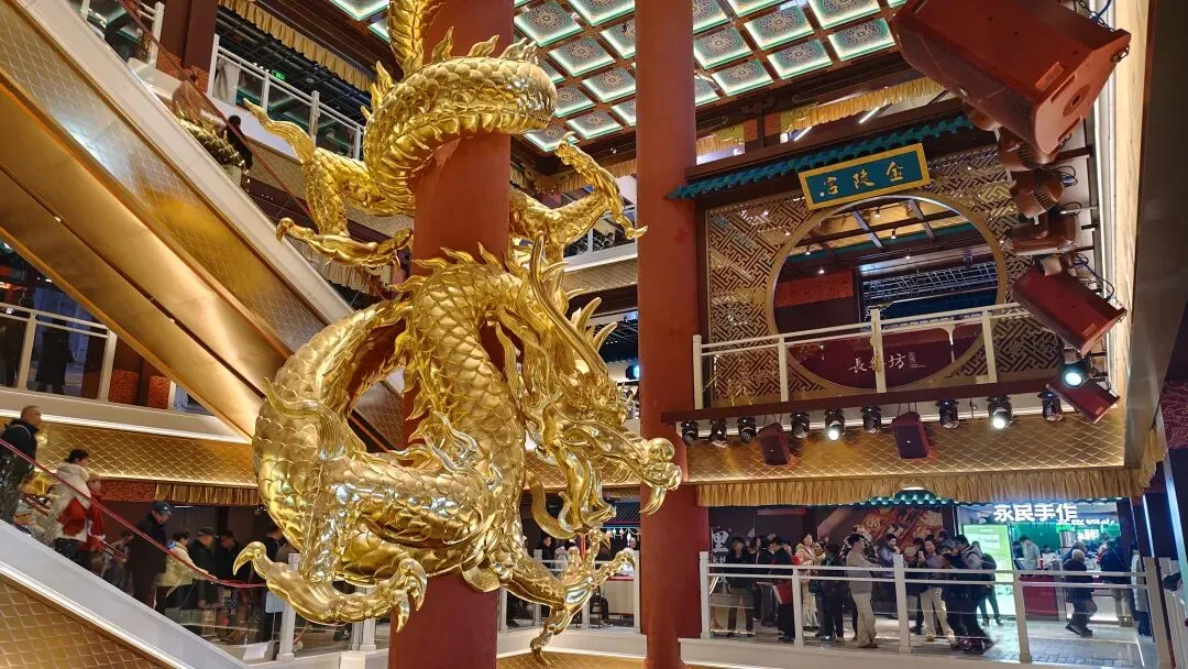金陵长乐坊,位于南京秦淮区长乐路132号,毗邻夫子庙、老门东,2月19日(正月初三)试营业。地铁武定门站往西步行可达。以大明文化为核心,以“明代书生赴考”为故事线,打造沉浸式文化空间,引入超200家特色品牌。以“科举文化”为脉络,以“明代书生泛舟赴考”为主线,融入“金陵四十八景”元素,将明代状元黄观从“赴考”到“登科”的故事线与空间场景深度绑定,串联起五层空间的文化叙事。一层:以“渡口”造型为起点,复刻古代考生乘船赴考的场景,结合中庭的通体贴金蟠龙柱与铝制仿斗拱殿宇,营造出“金陵宫”的恢弘气势。二层至四层:通过“魁星阁祈梦”“龙门桥鱼跃”等场景,隐喻科举之路的“祈福-登科”过程。其中,龙门桥雕琢二龙戏珠,桥下灵动鲤鱼暗喻“鱼跃龙门”。五层:屋顶花园“一望千年”以“金榜题名”为终点,南望老门东、中华门城墙,北瞰现代都市天际,形成古今对话的绝佳观景台。图文拍摄整理为小夕图集