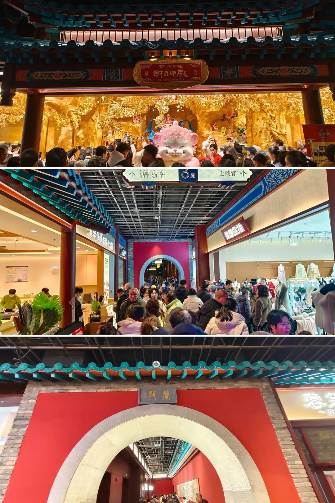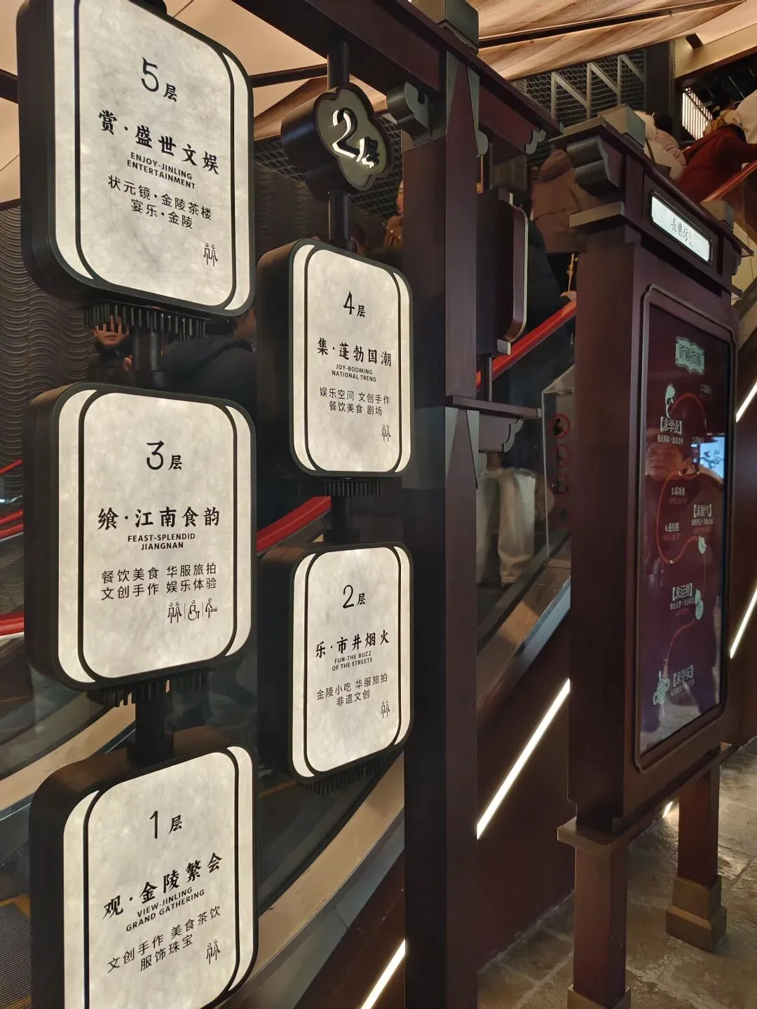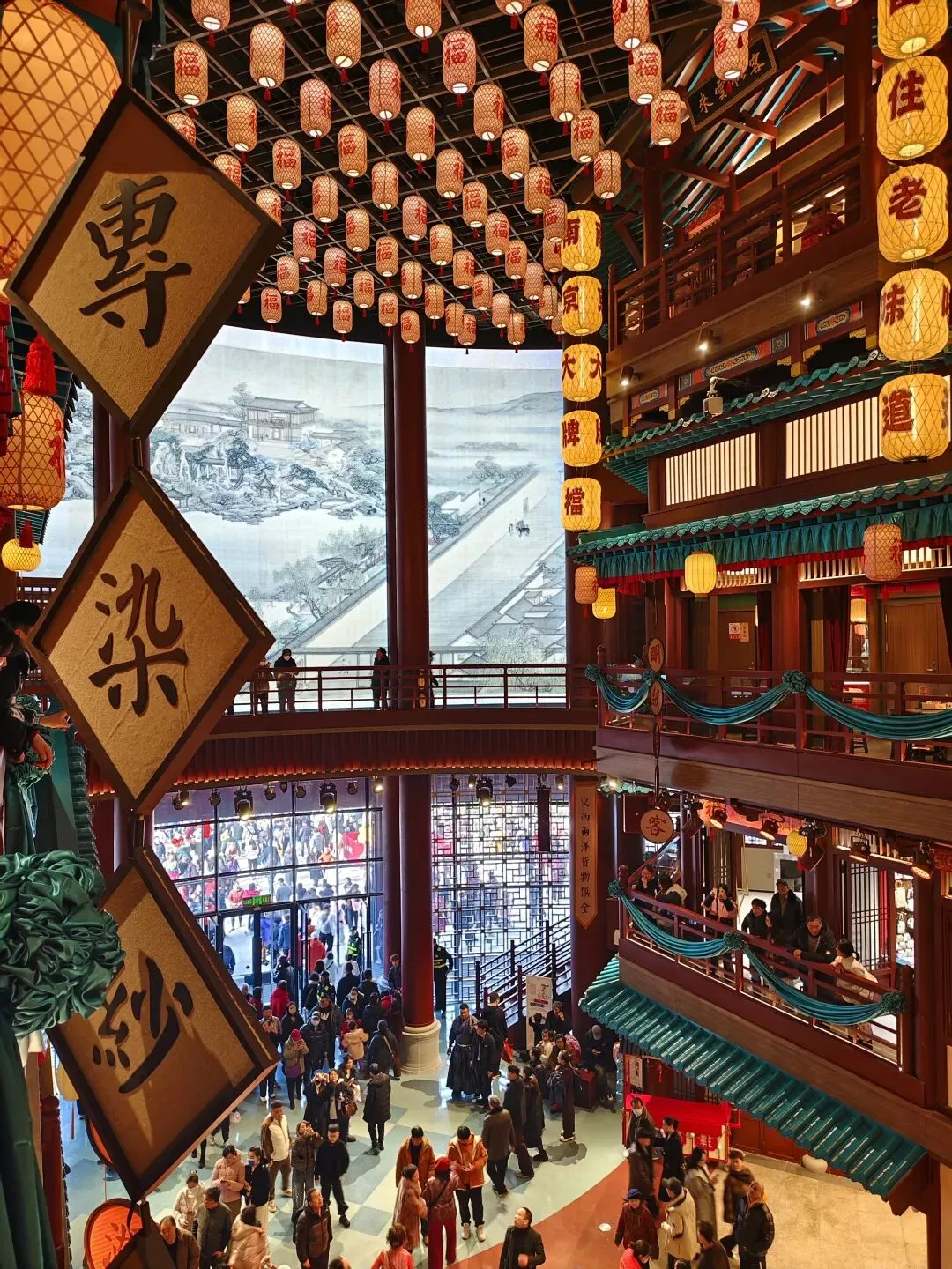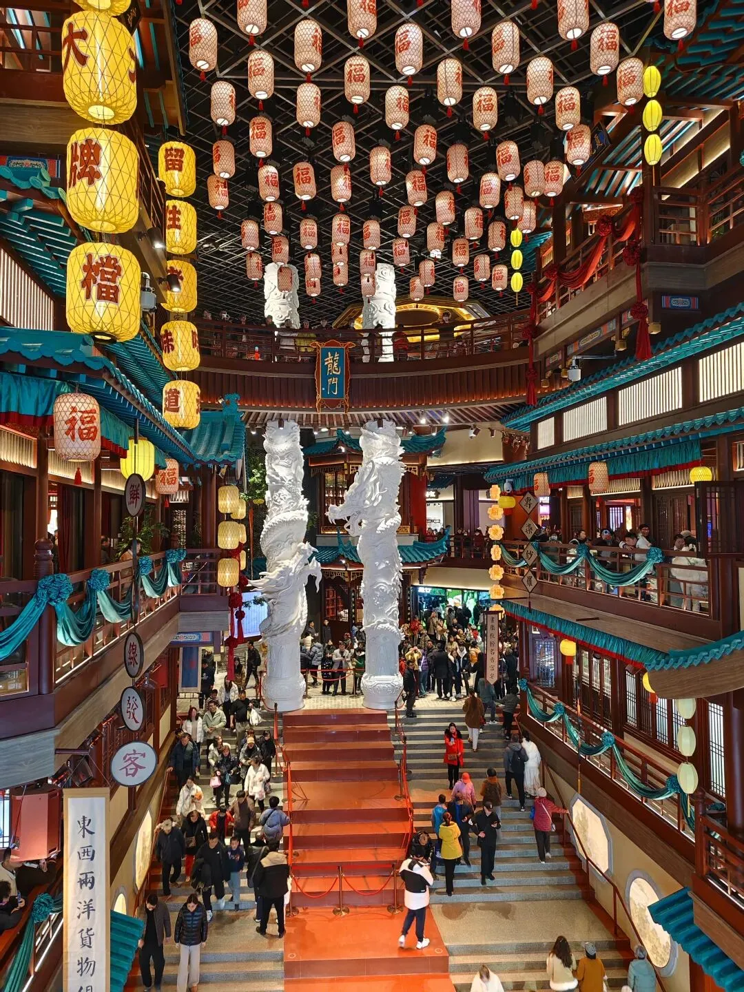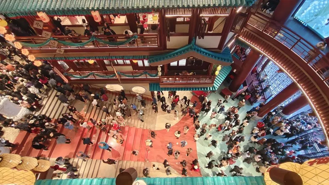 金陵长乐坊,位于南京秦淮区长乐路132号,毗邻夫子庙、老门东,2月19日(正月初三)试营业。地铁武定门站往西步行可达。以大明文化为核心,以“明代书生赴考”为故事线,打造沉浸式文化空间,引入超200家特色品牌。以“科举文化”为脉络,以“明代书生泛舟赴考”为主线,融入“金陵四十八景”元素,将明代状元黄观从“赴考”到“登科”的故事线与空间场景深度绑定,串联起五层空间的文化叙事。一层:以“渡口”造型为起点,复刻古代考生乘船赴考的场景,结合中庭的通体贴金蟠龙柱与铝制仿斗拱殿宇,营造出“金陵宫”的恢弘气势。二层至四层:通过“魁星阁祈梦”“龙门桥鱼跃”等场景,隐喻科举之路的“祈福-登科”过程。其中,龙门桥雕琢二龙戏珠,桥下灵动鲤鱼暗喻“鱼跃龙门”。五层:屋顶花园“一望千年”以“金榜题名”为终点,南望老门东、中华门城墙,北瞰现代都市天际,形成古今对话的绝佳观景台。图文拍摄整理为小夕图集