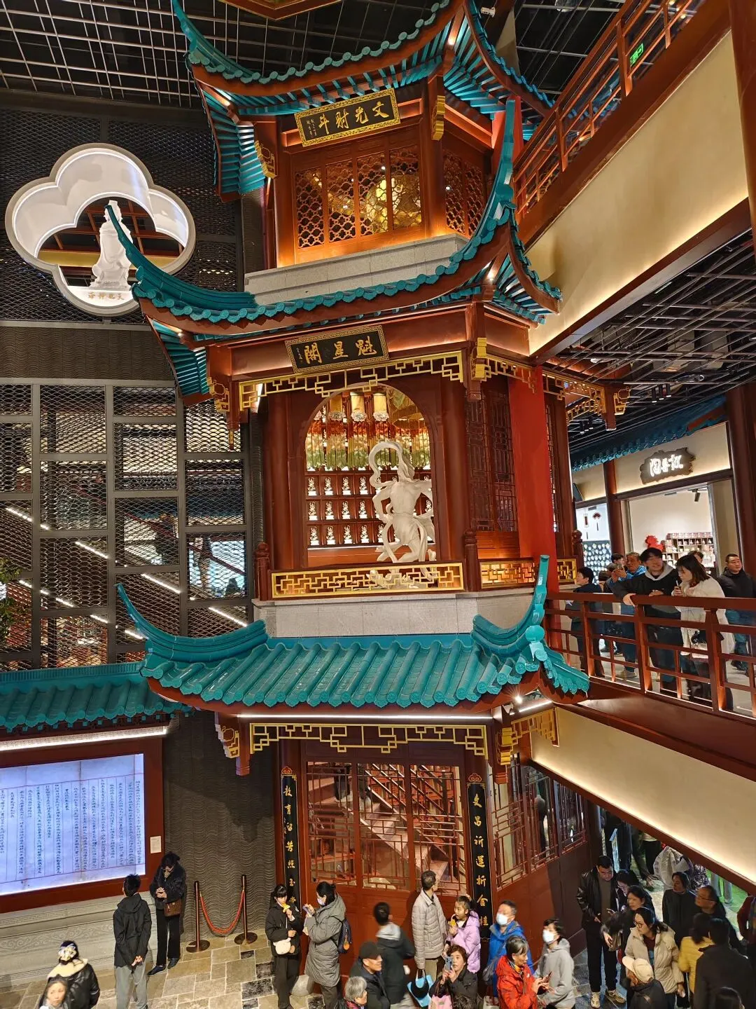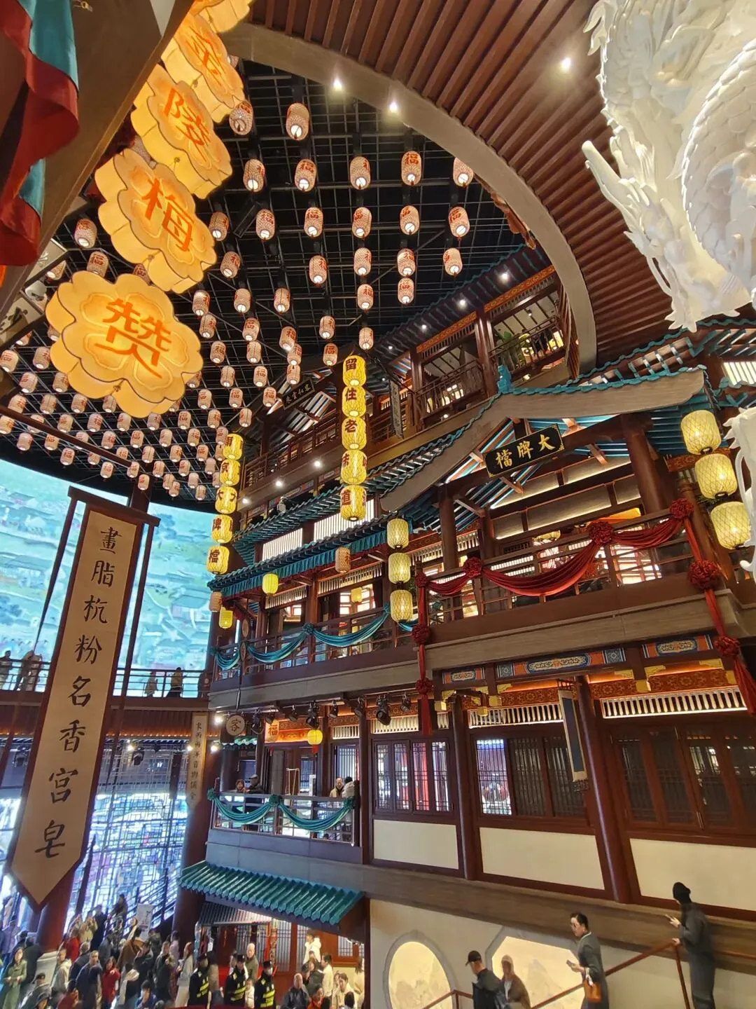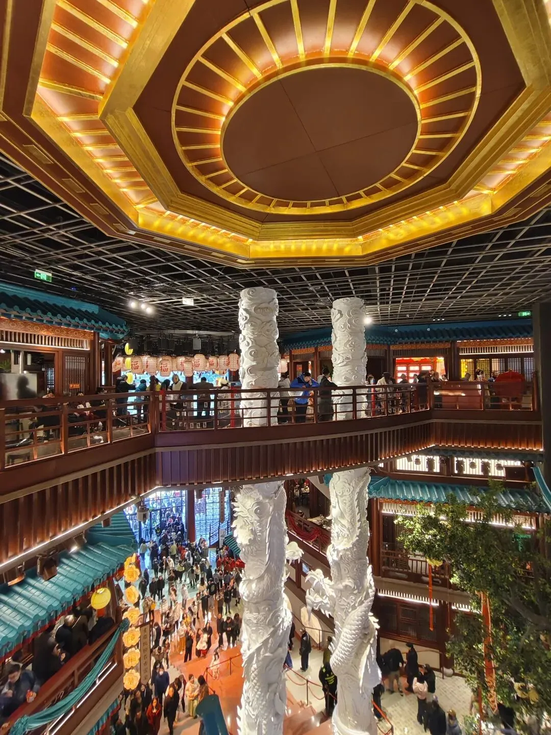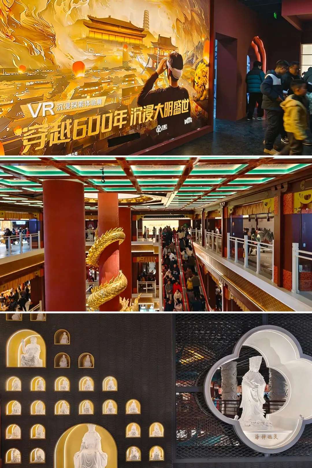 金陵长乐坊,位于南京秦淮区长乐路132号,毗邻夫子庙、老门东,2月19日(正月初三)试营业。地铁武定门站往西步行可达。以大明文化为核心,以“明代书生赴考”为故事线,打造沉浸式文化空间,引入超200家特色品牌。以“科举文化”为脉络,以“明代书生泛舟赴考”为主线,融入“金陵四十八景”元素,将明代状元黄观从“赴考”到“登科”的故事线与空间场景深度绑定,串联起五层空间的文化叙事。一层:以“渡口”造型为起点,复刻古代考生乘船赴考的场景,结合中庭的通体贴金蟠龙柱与铝制仿斗拱殿宇,营造出“金陵宫”的恢弘气势。二层至四层:通过“魁星阁祈梦”“龙门桥鱼跃”等场景,隐喻科举之路的“祈福-登科”过程。其中,龙门桥雕琢二龙戏珠,桥下灵动鲤鱼暗喻“鱼跃龙门”。五层:屋顶花园“一望千年”以“金榜题名”为终点,南望老门东、中华门城墙,北瞰现代都市天际,形成古今对话的绝佳观景台。图文拍摄整理为小夕图集