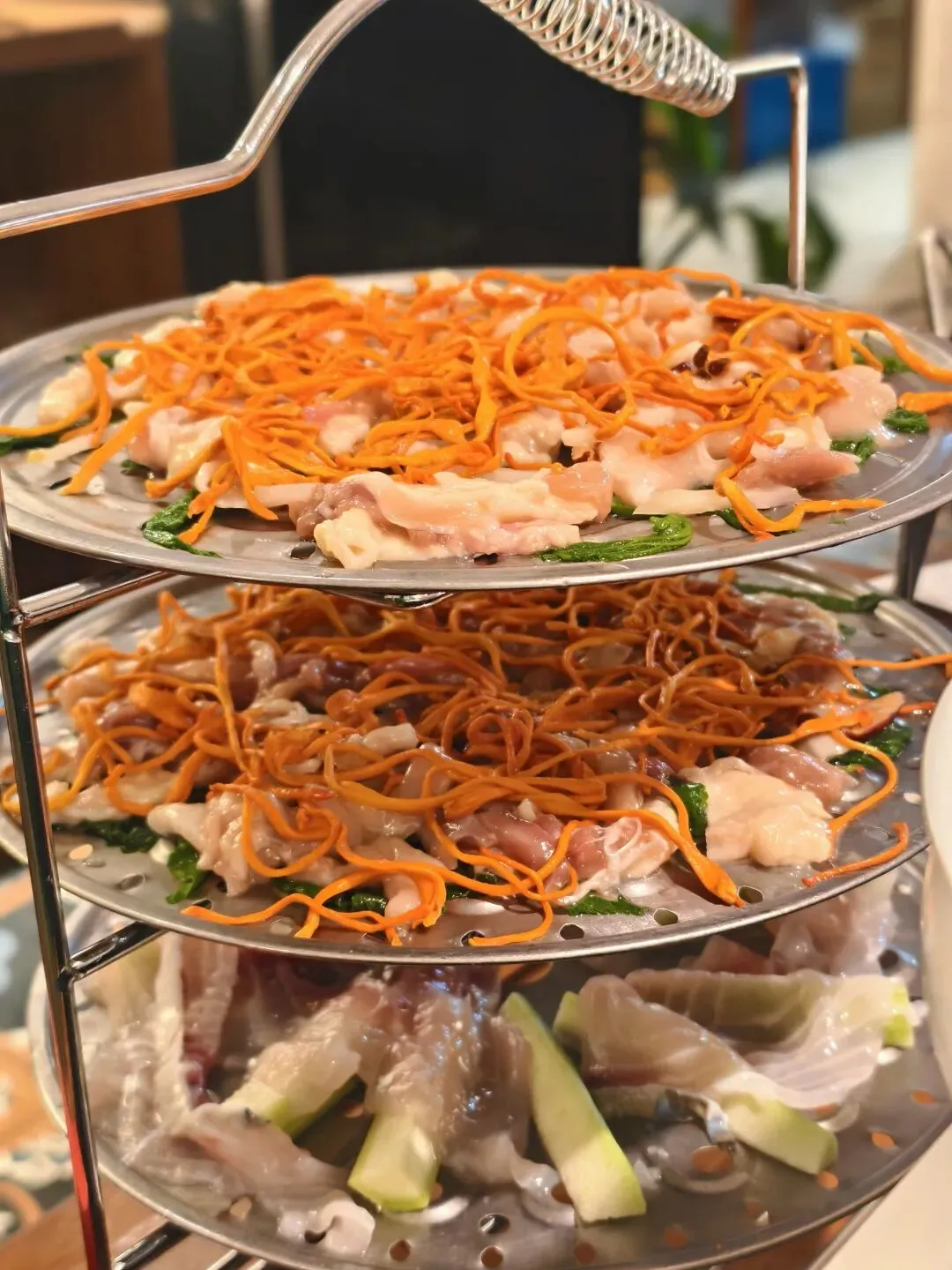 桑拿鸡倒挺符合它“桑拿”的名字,蛮特别的做法,底锅煮鸡汤,蒸笼里蒸鸡肉,鸡肉底下垫着桑叶,上面盖着虫草花。