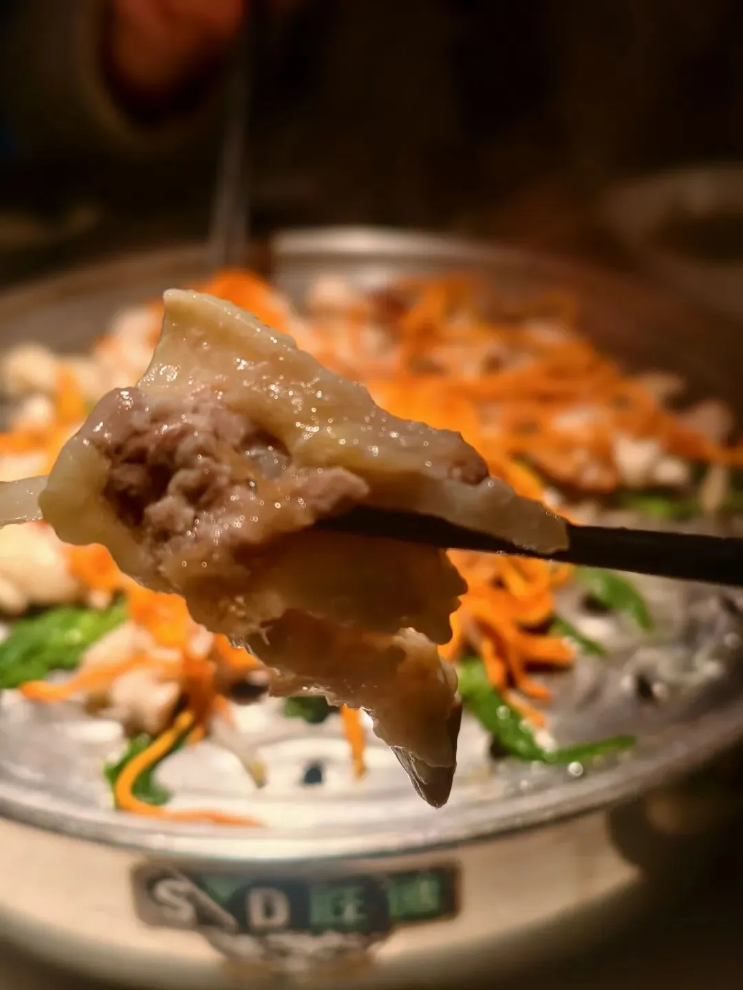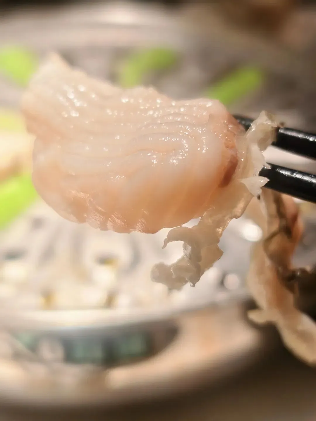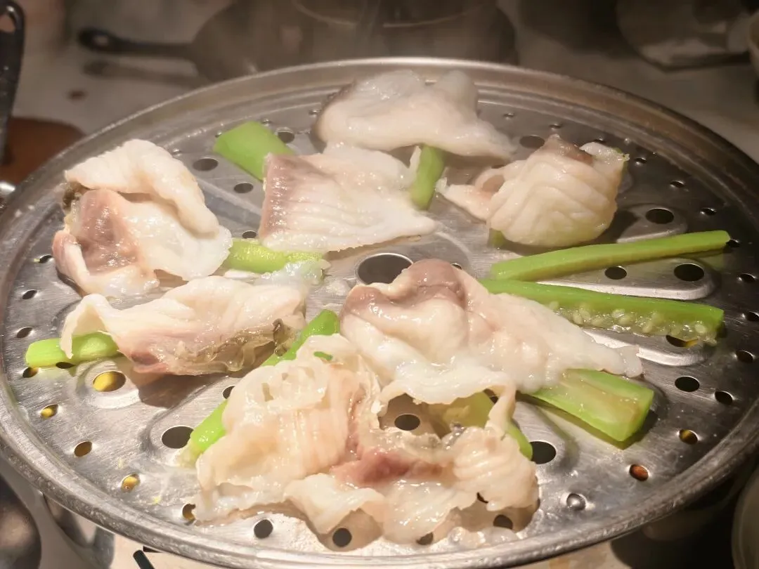 配的蘸料是比较粤式的风味,不是大张旗鼓的麻辣咸香,而是平静的咸鲜中,又带点沙姜的微“呛”。