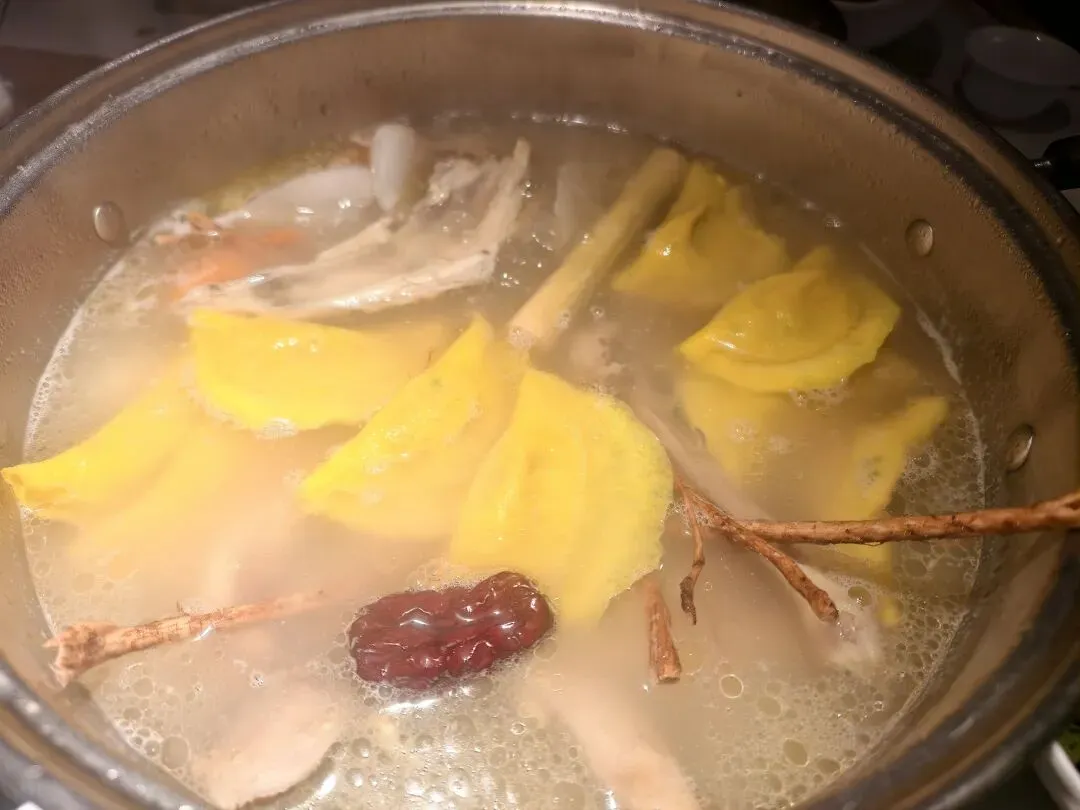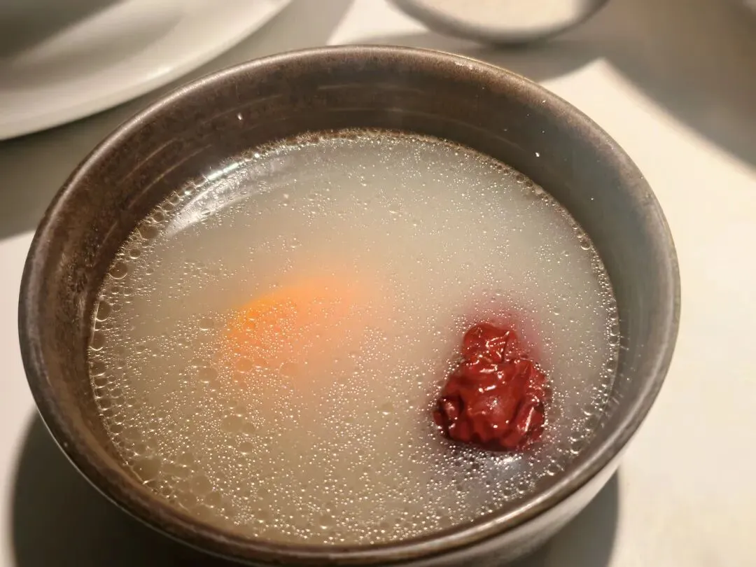 鸡汤加了竹蔗、海底椰、红枣之类的东西,喝起来有药香,也有微微清甜,煮到后面甜度会加重一些些。