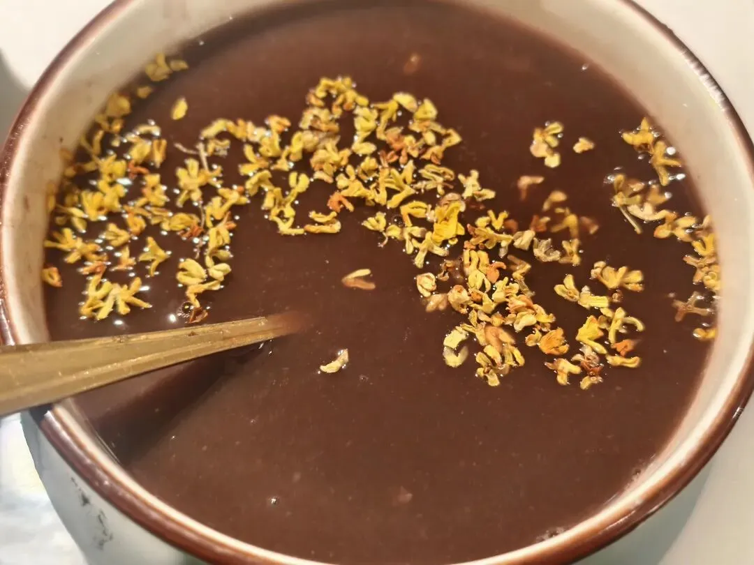 陈皮豆沙不稠密不稀薄,中等的配比,表层撒了星星点点桂花,陈皮味浓郁。