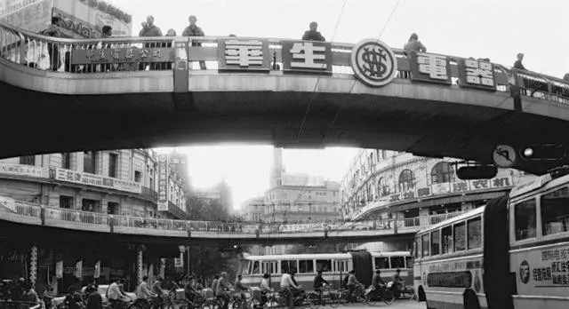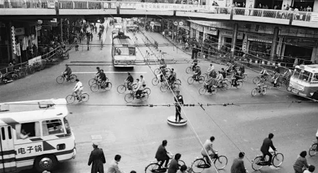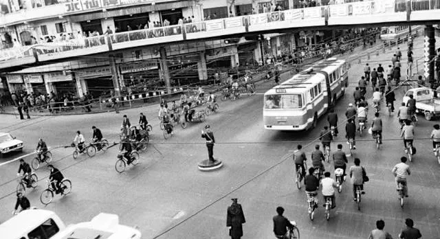 桥上那一溜栏杆锈里透亮,叫人行过街天桥,圆弧形,站在桥心往下看,电车和自行车擦肩而过,桥底警察叔叔站在小圆台上指挥,白手套一抬一落,像打鼓点一样利索,现在红绿灯多了,桥也拆了几座,路面宽了,老照片里这味儿却难再寻了。