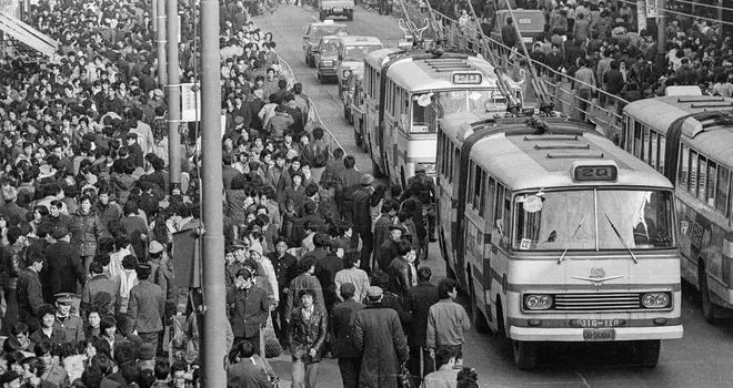 这张里人海一片素色,白衬衫最扎眼,脚上多是解放鞋,厚底,走起来有“扑扑”声,夏天汗水浸了鞋帮,风一吹又干,简单干净,没有什么logo,大家像彼此的影子,挤着也不觉得陌生。