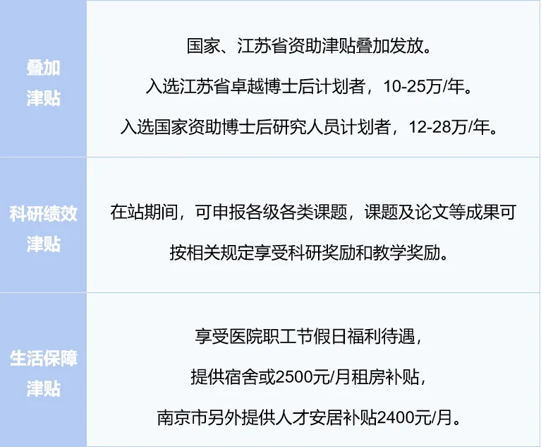 4. 特优博士后:原则上近3年以第一作者(排名前2的并列第一)或通讯作者(含共同通讯)在南京医科大学高水平期刊(高水平2类及以上,以我校最新发布的版本为准)上发表至少1篇科研论著;或者原则上近3年以第一作者(排名第一)或通讯作者(含共同通讯)在南京医科大学高水平期刊(高水平3类及以上,以我校最新发布的版本为准)上发表至少1篇科研论著;或者获得国家资助博士后研究人员支持计划A档(国家博新)或同等层次人才项目可直接入选。入选南京医科大学师资博士后的发放师资博士后待遇。