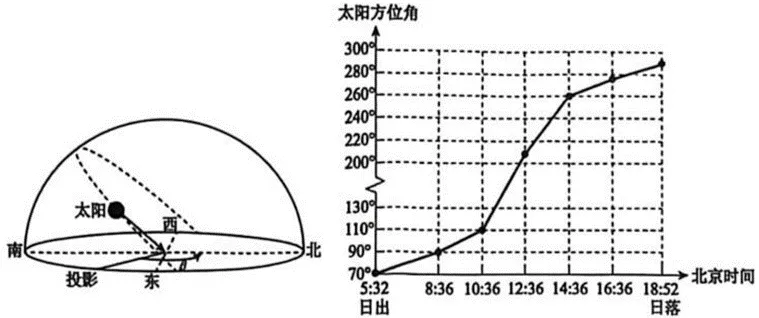 南昌市M高中在某地29°N,116°E 附近开展室外地理实践活动,通过太阳方位角测量论证“地方时6时,太阳是否位于正东方”和“太阳方位角的变化速度是否为15°/小时”。太阳方位角表示入射地面的太阳光线在地面的投影逆时针与正北方向的夹角(如图左中的β角)。图右示意2025年5月11日实测太阳方位角变化。据此完成1~3题。