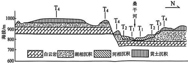 泥河湾古人类遗址位于河北阳原盆地,主要分布于桑干河及其支流两岸的河流阶地之中,被誉为“东方人类的故乡”。下图示意阳原盆地段的大田洼-泥河湾横剖面,T1~T4为不同时期形成的河流阶地,T1阶地由粉砂和黏土组成,T2、T3阶地由砂砾组成。完成下面小题。