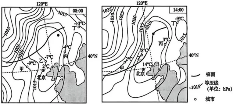 下图为2024年12月某日8:00和14:00亚洲部分地区地面天气简图。完成下面小题。