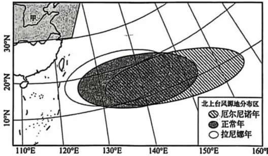 北上台风是指进入下图中甲区域的台风。研究表明,厄尔尼诺年北上台风的数量明显低于拉尼娜年和正常年,但强度较大。下图为3种不同类型年份北上台风生成源地的分布图。完成下面小题。