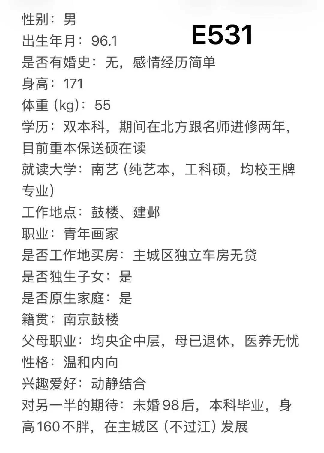 >南京脱单|96年,男,身高171,南京艺术学院研究生学历,南京本地人,主城区有房有车无贷款
