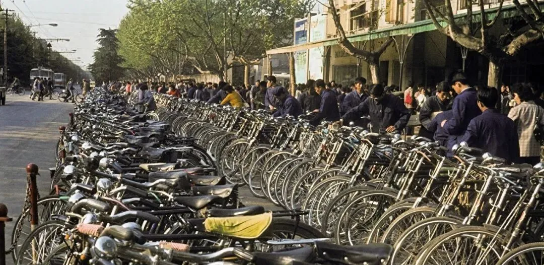 这个场景叫自行车海,永久凤凰红旗牌挤成两道铁浪,车把 chrome 一排亮得扎眼,早班的人把车锁往前轮一扣,抬头就往厂门跑,那个年月出门三大件里它最体面,谁要是新车上牌,邻居都得瞅两眼。