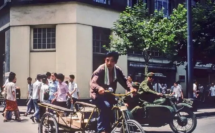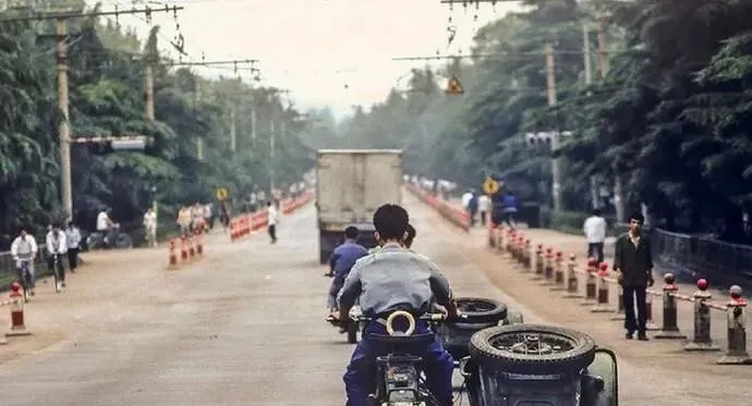 这辆前面带板的叫脚踏货三轮,木板被肩膀磨得亮亮的,师傅脖子上搭着白毛巾,哐当一转弯,旁边军绿色边三轮噌地窜过去,车铃和喇叭混在一起,热闹得很。