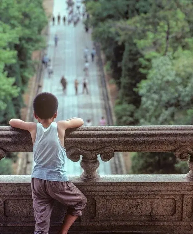 这位趴栏杆的小家伙就是当年的我们,背心被汗水黏住,脚丫一点点挪到石缝上,眼睛直勾勾盯着台阶底下的人群,等大人买冰棍,心里只念着那口凉,真是急得要命。
