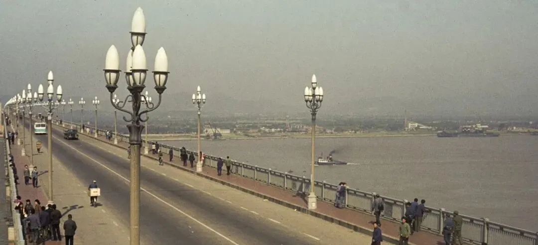 这条笔直的是长江大桥桥面,灯杆像莲蓬一样一排排立着,公共汽车缓慢地爬,江风裹着腥咸味儿吹上来,站在栏杆边,人和船影都被吹得发晕,以前过江靠轮渡,现在轻轨唰一下就过去了。