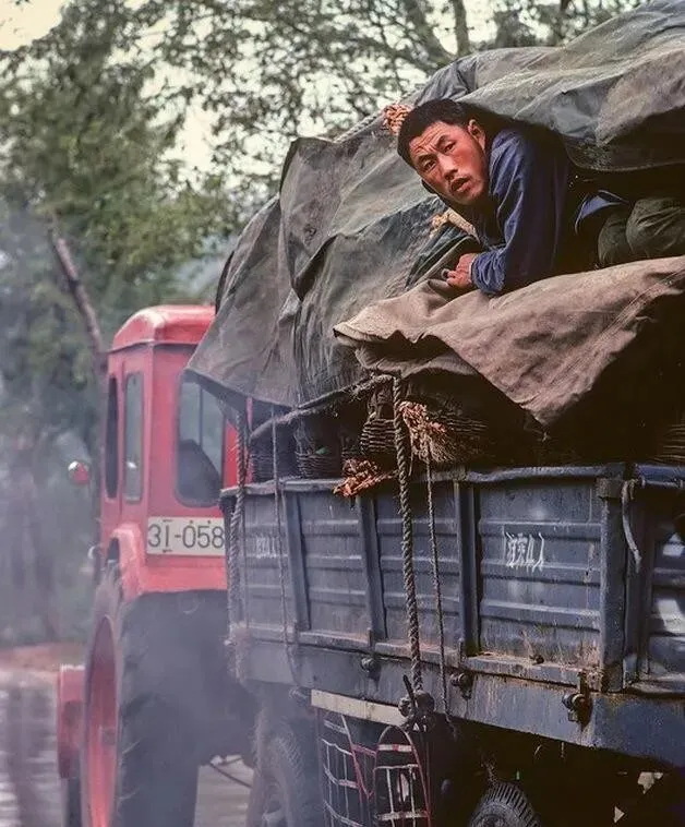 车斗里盖着篷布的是拉货车队,红拖拉机喷黑烟,把后面那辆蓝斗货车带得直晃,师傅探出半个身子看绳扣结没结实,嘴里嘟囔一句“别撒扣啊”,那年头跑一趟路,靠的就是胆子和力气。