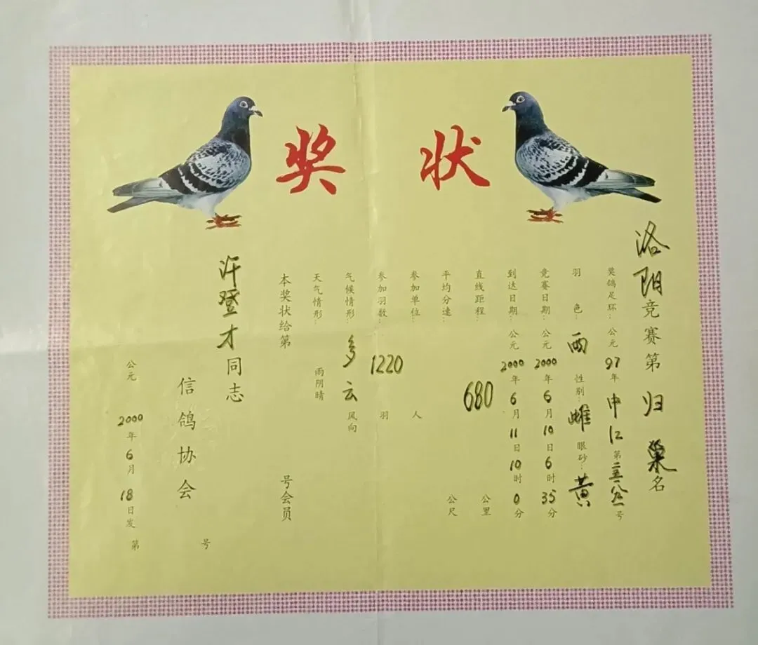 6.2000年,南京市白下区信鸽协会奖状。