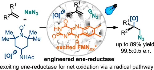 有别于先前引入叠氮基的生物催化策略,我们在此报道了一种净氧化光酶催化策略,该方法利用烯醇还原酶(EREDs)的直接可见光激发,实现了烯烃的高对映选择性叠氮氧化。该体系利用光激发的黄素辅因子作为强氧化剂,并与TEMPO-叠氮复合物协同,启动叠氮自由基的生成。随后生成的N3自由基和氧中心自由基在工程酶的活性位点内被精确调控,从而以极高的产率(高达89%)和对映选择性(高达99.5:0.5 e.r.)获得富集对映体的β-氧叠氮化物。